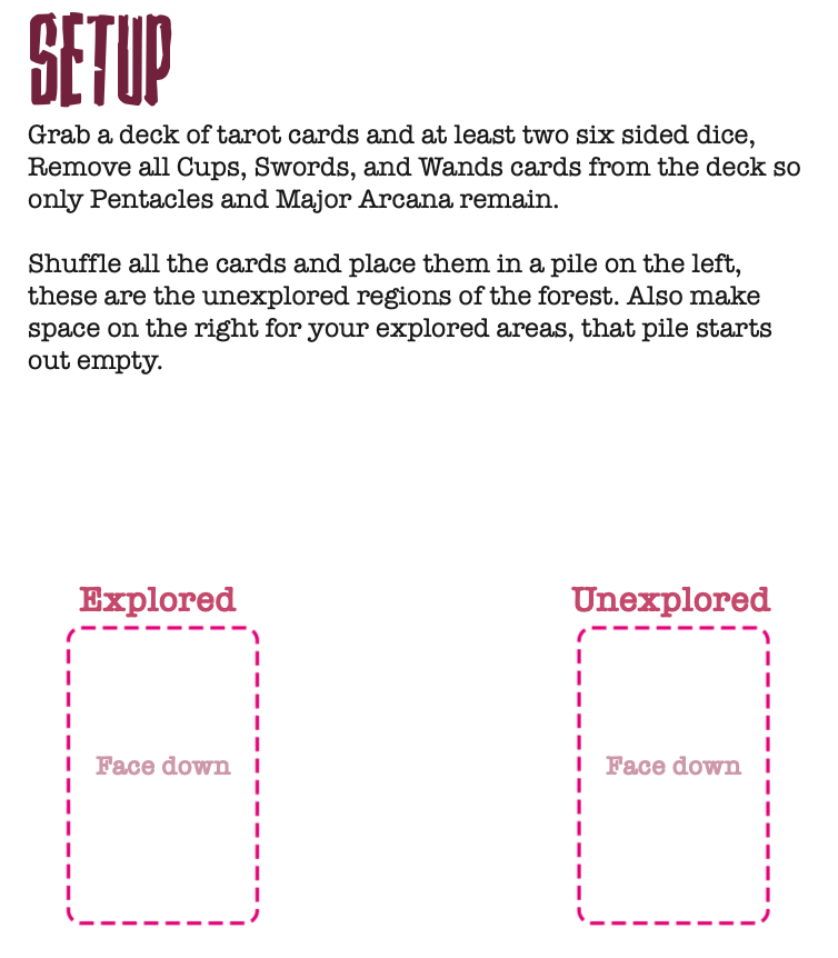 The game is played with a set of tarot cards, the cards correspond with locations or events that you can either explore or run from, the game is about making tactical decisions for when to explore certain areas, when to wait or when to head back to previous locations